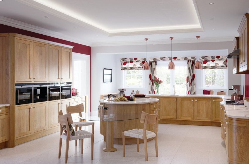 В большой кухне можно использовать любую удобную мебель, но часто пространство в центре помещения остаётся пустым. Для увеличения функциональности кухни, площадь которой от 20 м2, здесь устанавливают островную мебель. Она может быть разной по назначению: