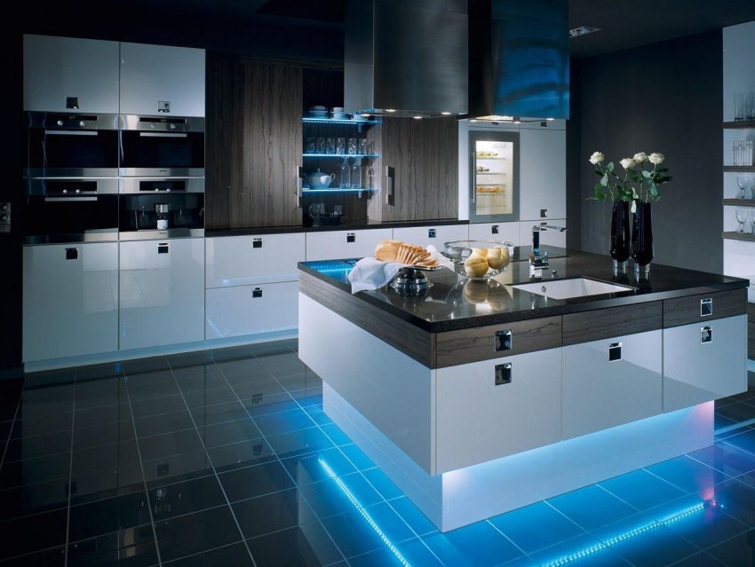 С помощью светодиодной ленты можно создавать необычные эффекты на кухне