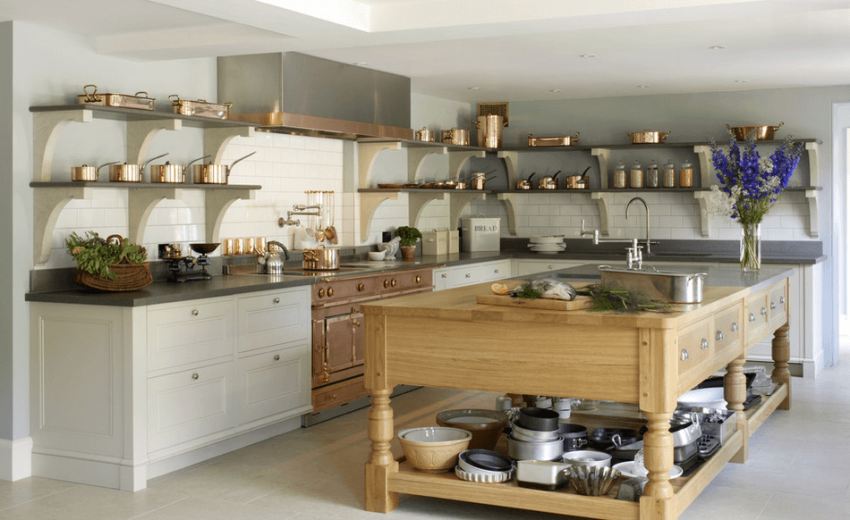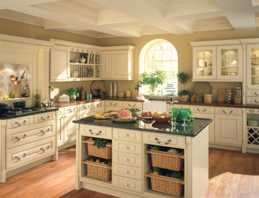 - на кухне в стиле кантри остров подчёркивает уют и практичность обстановки в деревенском стиле. Потолок часто украшают деревянные балки, столешница выполняется из камня, а деревянная мебель может быть как цвета натуральной древесины, так и светлых оттенков.