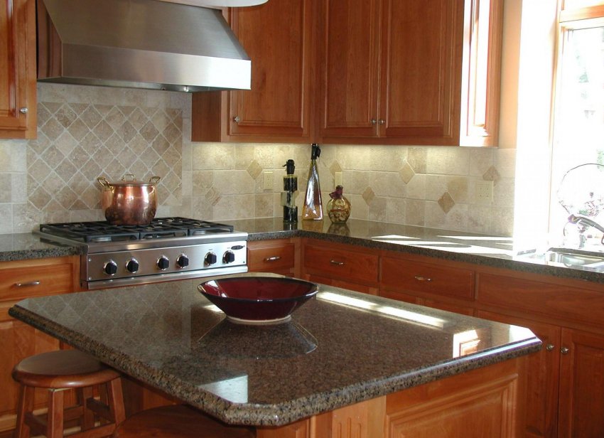 - в центре кухни может располагаться рабочая поверхность. Часто такая мебель представлена напольными шкафами со столешницей. Конфигурация с бутылочницами, ящиками, полками и другие деталями сделает эту часть кухни максимально функциональной. Мебель из древесины или ЛДСП представлена в разных цветах и стилях, но важно обратить внимание на качество столешницы. Эта поверхность должна быть устойчива к ударам, загрязнениям и перепадам температур. Изделия из натурального или искусственного камня, мраморной крошки, ударостойкого пластика являются самыми популярными вариантами. Размеры мебели для рабочей зоны зависят от площади кухни, но лучше всего выбирать варианты, занимающие не менее 1 м2;