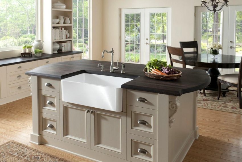Раковина в центре кухни обеспечит комфорт в подготовке продуктов и мытье посуды
