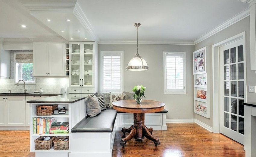 - диван позволит разделить кухню от гостиной. Для этого также можно использовать обеденный стол, барную стойку, а диван дополняет эту зону. Мебель должна быть компактной и с практичной обивкой, за которой легко ухаживать.