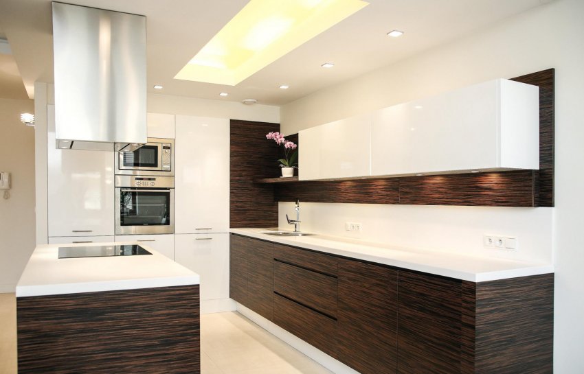 - если в островную мебель вмонтирована плита, то на потолке размещают вытяжку. При этом уместно натяжное ПВХ покрытие или гипсокартонные конструкции белого или любого другого цвета. Для большего выделения центральной части кухни стоит создать невысокий подиум. Сделать это можно на стадии ремонта, соорудив бетонную стяжку. Предварительно нужно предусмотреть расположение коммуникаций;