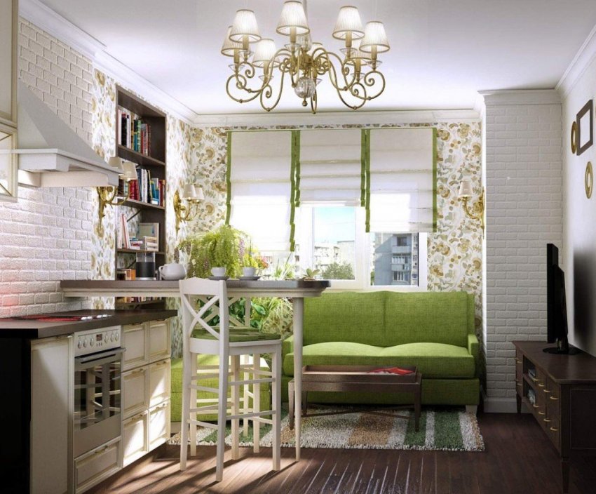 - текстиль (шторы, салфетки, скатерти, ковры и т. п.) лучше всего выбирать из натуральных тканей, например, хлопок и лён. Они подчёркивают гостеприимную и уютную обстановку. Светлые изделия с ярким рисунком (клетка, несложные узоры, полосы и т. п.) дополнят лаконичный дизайн кухни. Практичны рулонные однотонные шторы, а вот объёмные портьеры лучше всего подходят для гостиной, а не для кухни;