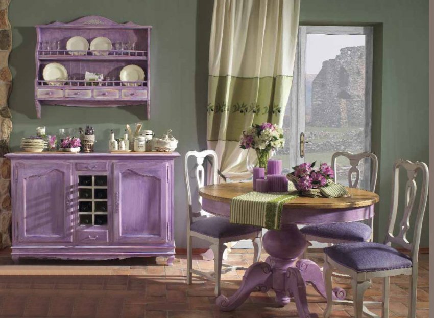 Винтажная мебель и сиреневый цвет — оригинальное сочетание для кухни