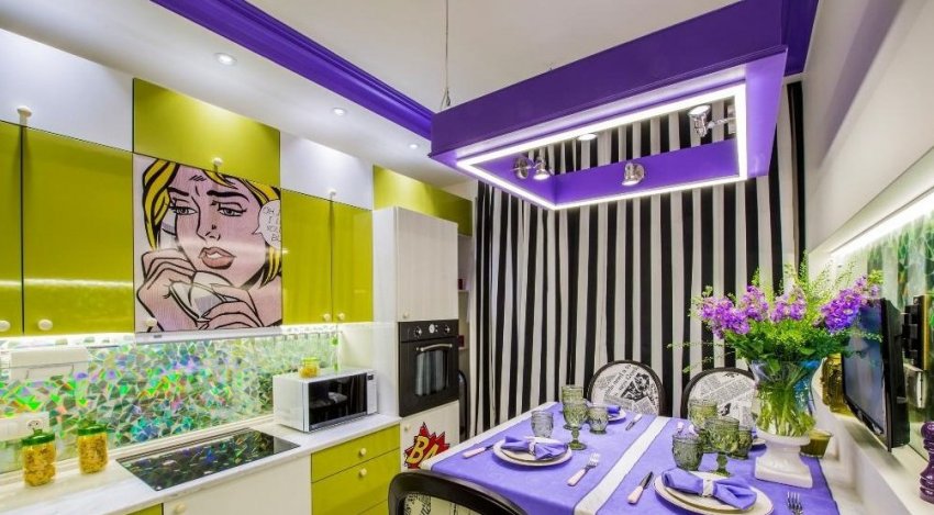 - стиль поп-арт — это сочетание ярких деталей футуристичных форм. В таком интерьере уместны комбинации из 3 – 4 ярких тонов, абстрактные картины, пластиковая мебель, детали необычной формы. Гармонично дополнит обстановку яркий фиолетовый цвет, но не стоит забывать о нейтральной основе: белом, бежевом, сером;