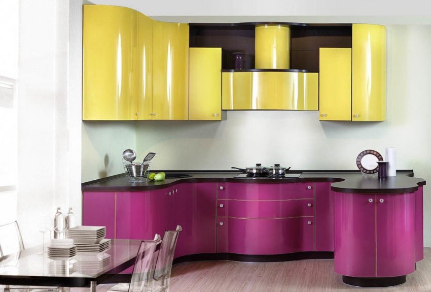 - стиль авангард предполагает мебель строгих форм и с однотонными фасадами, контрастность цветов, один светлый оттенок и два ярких, а в качестве дополнительного часто используется чёрный. Поэтому для авангарда подойдёт фиолетовый гарнитур, который хорошо сочетается с белыми стенами и жёлтым фартуком;