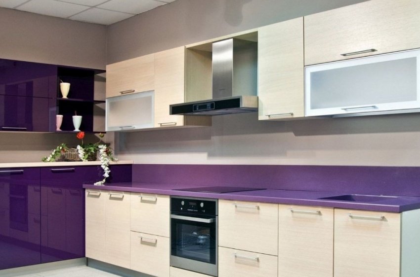 Гарнитур может быть двухцветным. Например, фасады верхних шкафов выполнены в белом цвете, а нижних — в сиреневом, лавандовом или другом тоне фиолетовой палитры. Если же в обстановке предполагается лишь малое количество такого цвета, то стоит выполнить интерьер в бежевом, белом или сером тоне, а яркими будут шторы, текстиль или другие элементы декора.