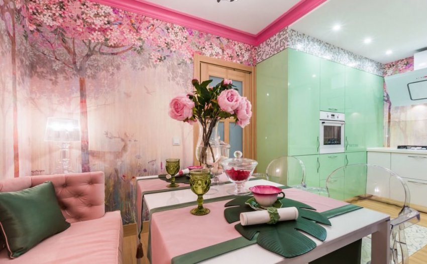 - светло-зелёный или фисташковый с бледно-розовым позволяет получить романтичную, лёгкую и светлую обстановку кухни. При этом не стоит использовать много розовых и ярких предметов, а в качестве фонового оттенка могут служить такие тона, как бежевый, бледно-серый, белый;