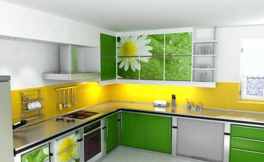 Жёлто-зелёная кухня выглядит ярко и нарядно