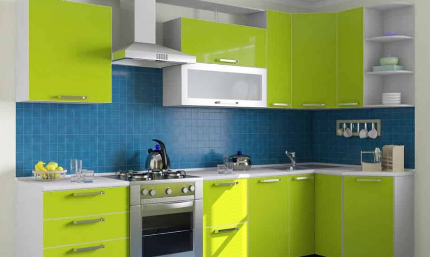 - голубой и синий в сочетании с зелёным подходят для яркого дизайна. Двухцветный гарнитур или текстиль, отделка фартука плиткой двух цветов и другие способы позволят создать стильную обстановку. Можно использовать как яркие, так и бледные тона;