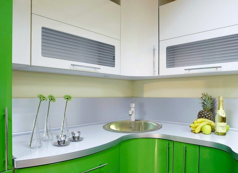 У моей кумы салатовый (глянец) с тёмно-коричневым (венге) столешница и фартук, стены кухни светлые пол коричневая плитка. Всё в общем неплохо Маленькие кухни лучше всего не дробить двумя цветами. Сделайте фасады светлыми. Чем больше светлых оттенков, тем светлее будет казаться помещение, и побольше освещения разного. У меня на старой квартире была маленькая кухня (18 лампочек) и 3 варианта освещения. Фасады светлый беж, столешница и пол светлый бук, плитка св. беж (маленькая 10х10 расшита коричневым), стол-табуретки то же бук, стены св. персиковые и светлые шторы. Техника и мойка в стальном цвете (холодильник беж) очень светло было. И не надоедало всегда аксами добавить цвет можно.