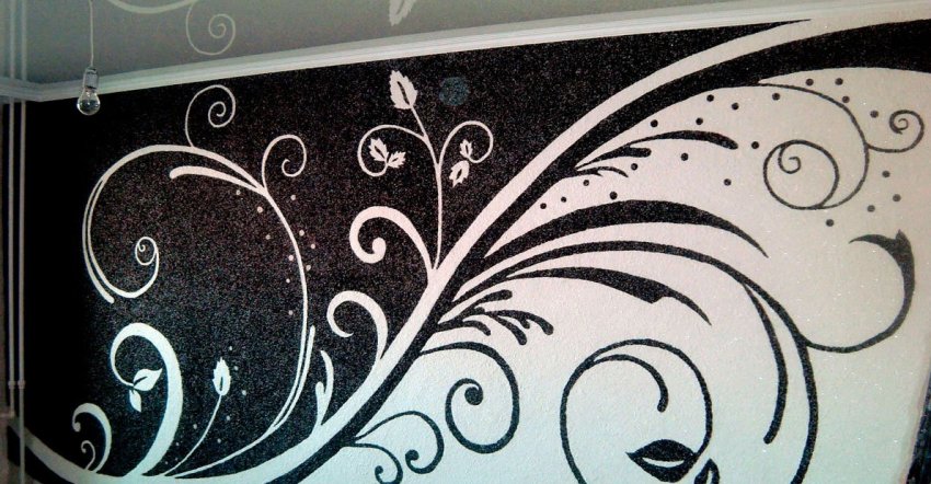 - узоры из разноцветных жидких обоев. При этом стена полностью оформляется такой отделкой, но в процессе используются разноцветные смеси. Предварительно на прогрунтованной поверхности рисуют с помощью трафарета нужный узор, а затем наносят обои в соответствии с декором.