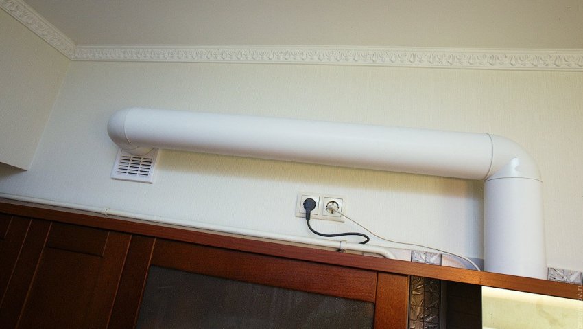 - Розетку под встраиваемую вытяжку размещают на стене под соседним шкафом. Для прокладки кабеля можно сделать штробу в штукатурке, но можно протянуть провод и через боковую стенку шкафа. Отверстие высверливается по диаметру силового проводника — обычно от 5 до 8 мм. Сделать это нужно перед тем, как устанавливать вытяжку над плитой. Если верхняя крышка шкафа находится на одном уровне с вытяжкой, практикуется расположение розетки над ним. Но для того чтобы добраться до неё, нужно будет встать на табурет или стул. С учётом того, что вытяжку отключают очень редко, это вполне приемлемый вариант. Если шкафов рядом нет, розетка размещается на стене по обычным стандартам (со смещением в 20–25 см).