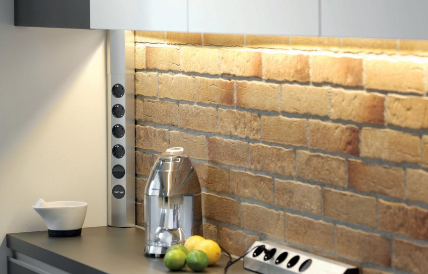 Угловые розетки можно размещать не только в месте пересечения стен, но и между столешницей и фартуком
