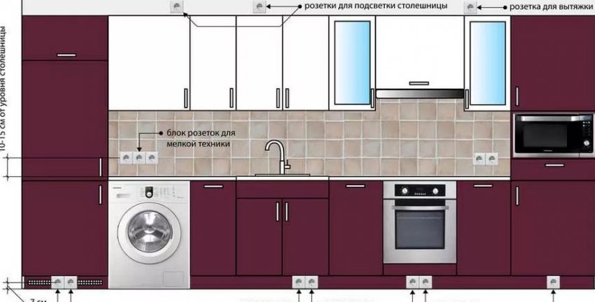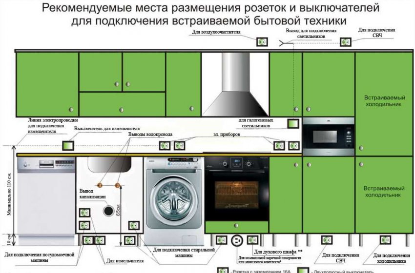 Рекомендуемые места размещения розеток и выключателей на кухне