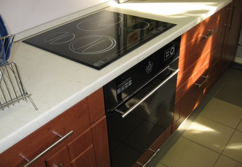 При правильном подключении плиты силовые провода скрыты внутри соседней кухонной мебели