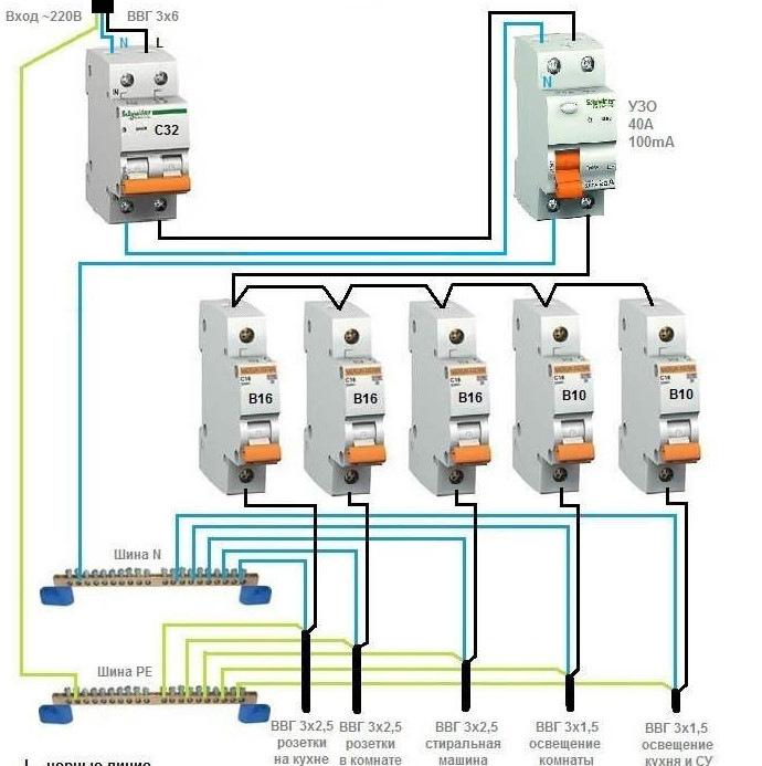 - На распределительном щите устанавливается прибор УЗО (устройство защитного отключения) номиналом не менее 40 А (и током утечки от 100 мА). Это касается не только кухни, но и всей квартиры в целом.