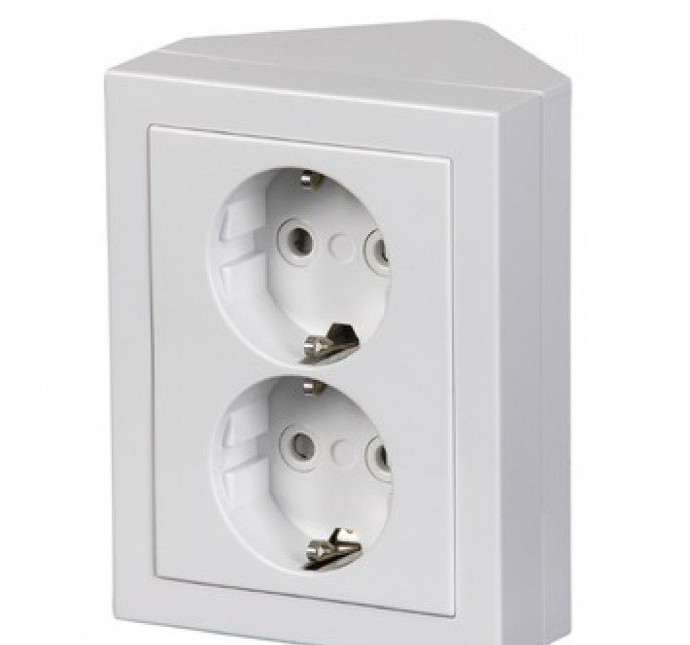- Угловые. Специальный тип розеток, форма и конструкция которых позволяет устанавливать их в углах между стенами или между стеной и рабочим столом. Фактически является разновидностью накладного источника питания, поскольку для монтажа не требуется углубляться в стену. Как большинство современных розеток, угловые модели изготавливаются из прочной качественной пластмассы с высокими диэлектрическими показателями. Чаще всего используются в виде модулей с тремя-пятью штепсельными разъёмами.
