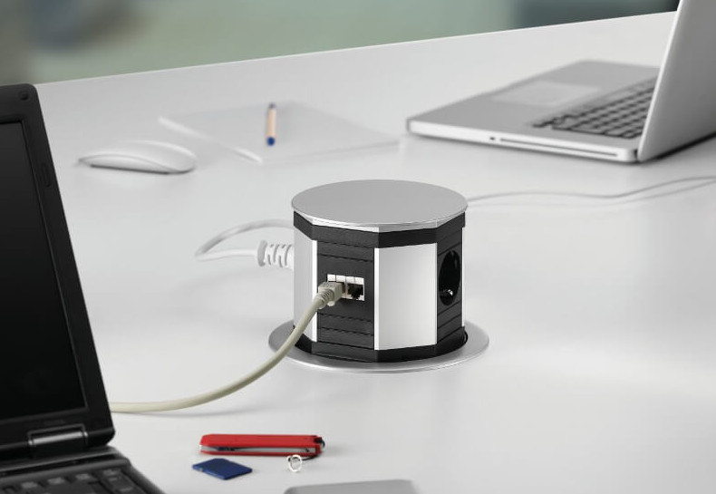 - к выдвигающейся розетке можно подсоединять не только не только силовые, но и слаботочные кабели: телевизионную антенну, интернет, телефон и т. д.;