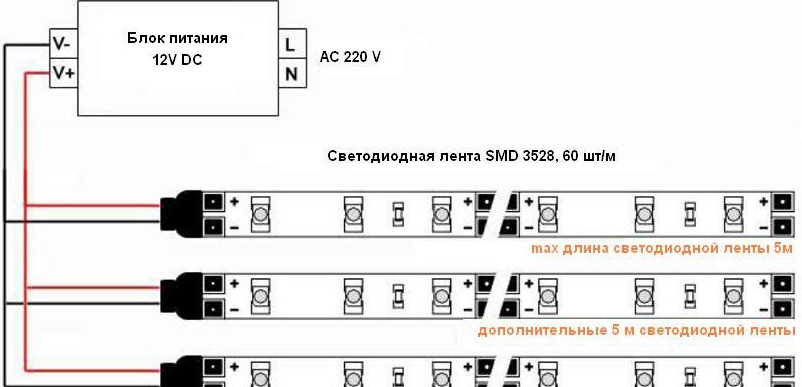 Пятиметровые отрезки светодиодной ленты можно соединять только параллельно