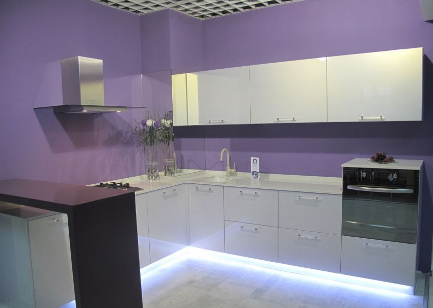 - подсветка нижней части шкафов выполняет исключительно декоративную функцию. Для получения эффекта парящей в воздухе мебели по низу шкафов прокладывается светодиодная лента. Накладные или врезные приборы не подойдут, ведь они не смогут обеспечить равномерный поток света по всему периметру гарнитура.