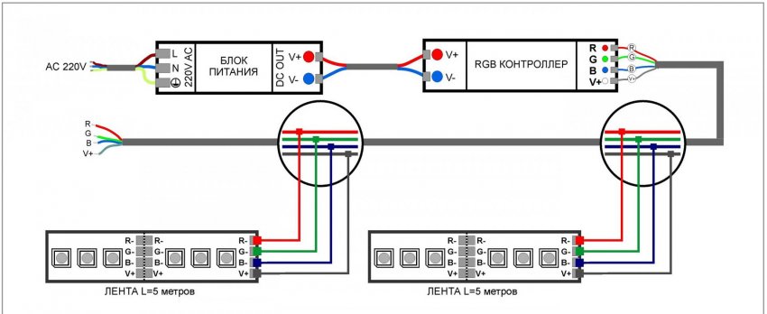 Многоцветная лента RGB подключается к блоку питания через специальный контроллер