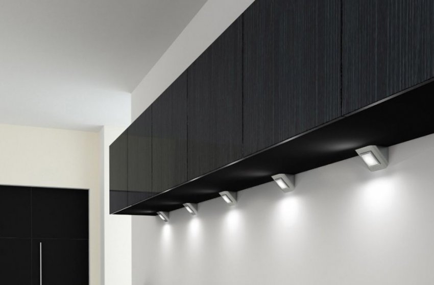 Под шкафами можно разместить лампу, ленту или светильники