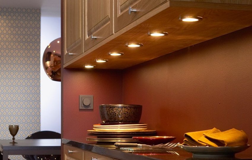 - подсветить рабочую поверхность, на которой подготавливают продукты, можно с помощью светодиодных лент или накладных светильников. Такие устройства легко крепятся к стене или под шкафами, освещая нужную область. Если используются точечные светильники, то поток должен быть направлен на середину рабочей области. Лента с диодами обеспечивает равномерную освещённость пространства;