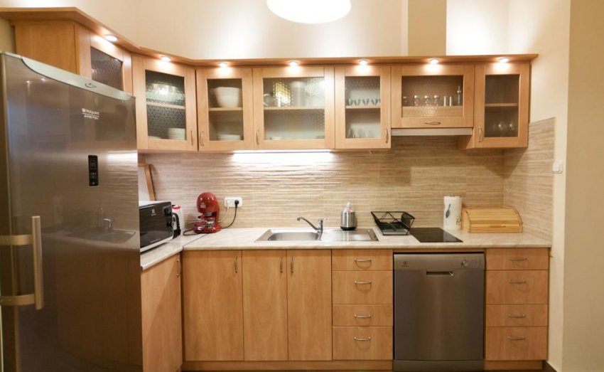 - наличие устройств освещения внутри шкафов и ящиков даёт дополнительные удобства при пользовании мебелью и обеспечивает стильное оформление кухни. Источники света располагают на боковых стенках или верхней части внутри шкафов. При этом важно тщательно определить положение проводов, чтобы избежать их перегиба в результате закрывания дверцы. Накладные приборы внутри шкафов будут занимать много места, поэтому более уместны ленты и встроенные светильники;