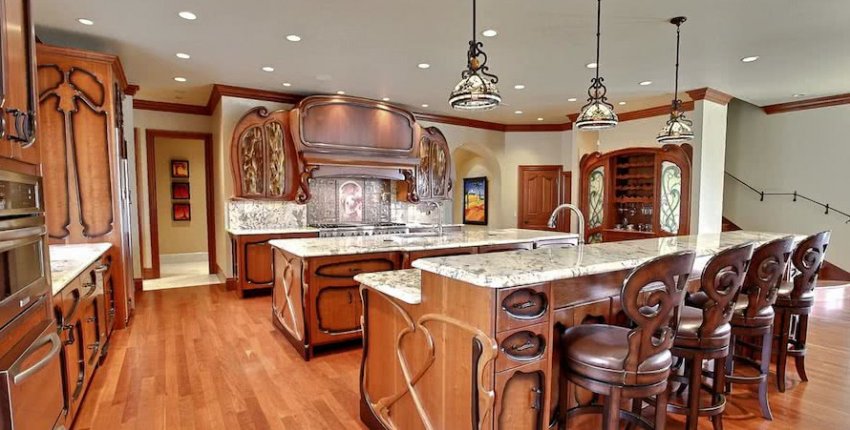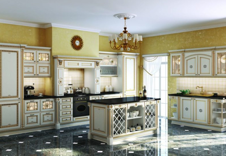 - викторианский дизайн предполагает наличие в обстановке элементов роскоши, например, массивных хрустальных люстр, мебели с резьбой и позолотой, наличие островной рабочей зоны. Он подходит для оформления просторного помещения, кухни-гостиной или кухни-столовой;