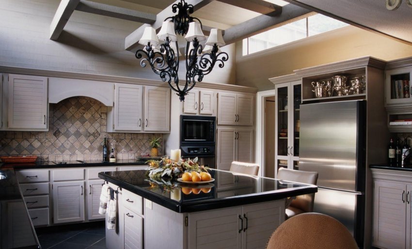 - люстра — обязательный прибор освещения на кухне или кухне-гостиной. Её размещают над обеденным столом или в центре помещения. Дополнительно в мебель, ниши, по периметру потолка могут быть установлены точечные светильники. Все приборы могут включаться одновременно или же по отдельности.