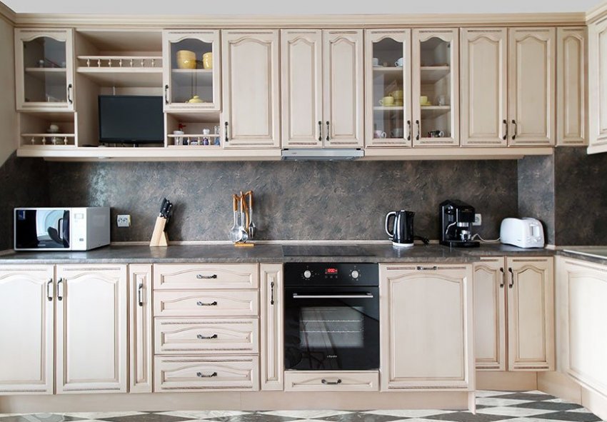 - современная бытовая техника завуалирована под старинную и встроена в кухонный гарнитур;
