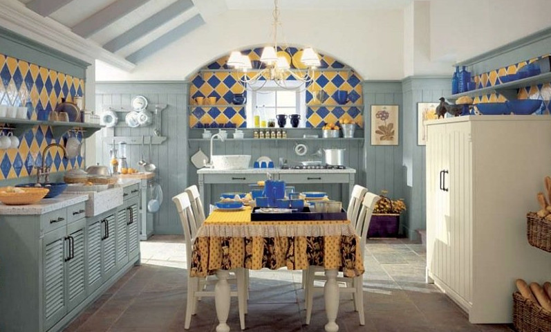 - дополнение голубого цвета жёлтым делает интерьер жизнерадостным и нарядным. Оттенки могут быть бледными или насыщенными. Эффектным является жёлто-голубой гарнитур. Не менее стильно выглядит и фартук, но можно разнообразить интерьер разноцветной посудой;
