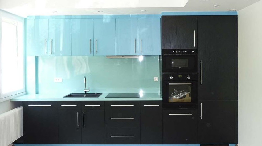 - фартук из пластика, стекла или керамической плитки хорошо дополнит гарнитур голубого или иного цвета. Однотонные покрытия уместны для мебели с узорчатыми или яркими фасадами, а фартук с рисунком дополнит лаконичный гарнитур. Столешница из искусственного камня голубого цвета сочетается с синим, бежевым, белым, бирюзовым гарнитуром. Необычно выглядит коричнево-голубая мебель;