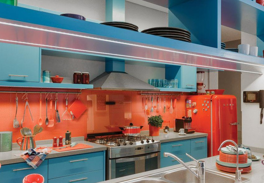 - красный и голубой — яркое контрастное сочетание. Не стоит оформлять кухню полностью в таких тонах, иначе дизайн будет очень экспрессивным и неприятным. В голубом интерьере достаточно красных штор и салфеток или керамической плитки фартука;