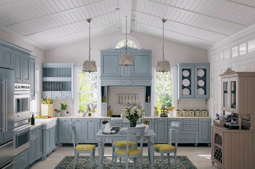 - интерьер в стиле прованс напоминает обстановку уютного сельского дома во Франции. Деревянная мебель голубого или другого светлого цвета, белый текстиль, цветочные принты, натуральные материалы характеризуют это направление дизайна. Пластик в таком стиле неуместен. Для обустройства кухни применяются стекло, древесина, металл, натуральные ткани;
