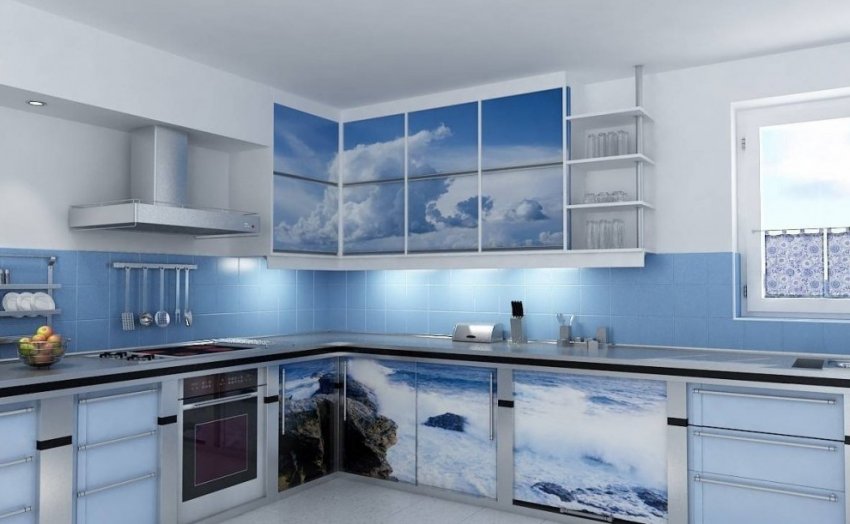 - кухонный гарнитур голубой окраски — простое решение, не требующее выбора красок, варианта отделки и сложного ремонта. Шкафы выбирают в соответствии с дизайном помещения. Однотонные фасады подходят к классическому интерьеру, а также кантри, провансу, минимализму, хай-теку и другим лаконичным вариантам оформления. Мебель с узором или фотопринтом оптимальна для стилей поп-арт, средиземноморского и других видов оформления. Гарнитур из ЛДСП с деревянными фасадами хорошо подходит для обстановки в классическом или деревенском стилях, а фасады с пластиковым покрытием — идеальное решение для современной обстановки;
