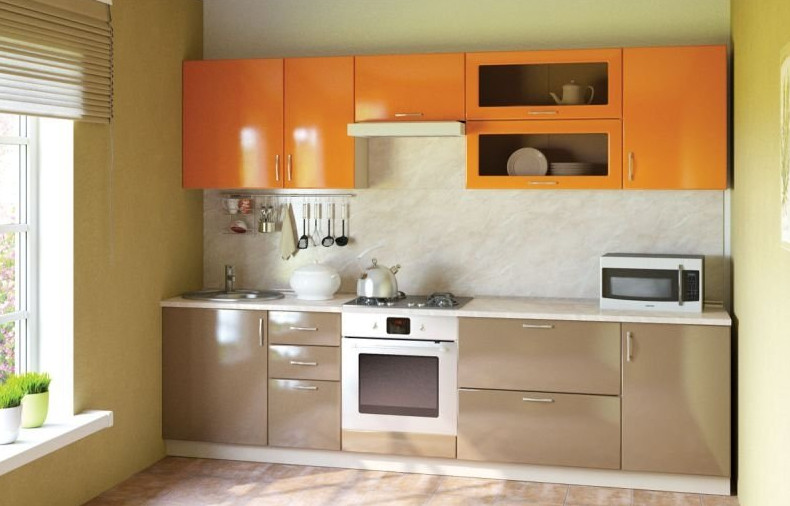 - гарнитур цвета капучино — универсальное решение для кухни любой площади, освещённости и стиля. Мебель может быть из натуральной древесины, ЛДСП или МДФ с пластиковым покрытием. Серебристая или золотистая фурнитура идеально дополнит подобную мебель. Размер, форму и конфигурацию шкафов выбирают в зависимости от площади кухни. При этом популярны двухцветные гарнитуры. Фасады таких шкафов выполняются в двух разных цветах, например, капучино и белый;