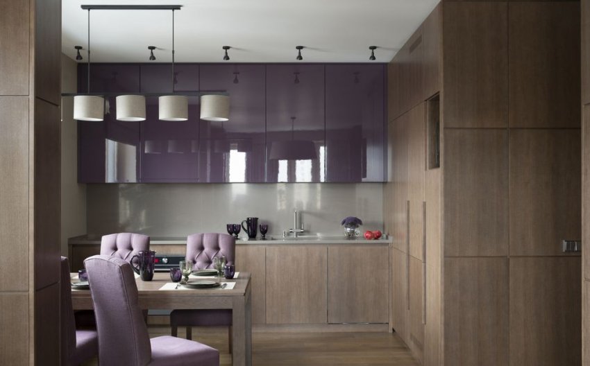 Строгий и загадочный интерьер создают лиловый и коричневый тона
