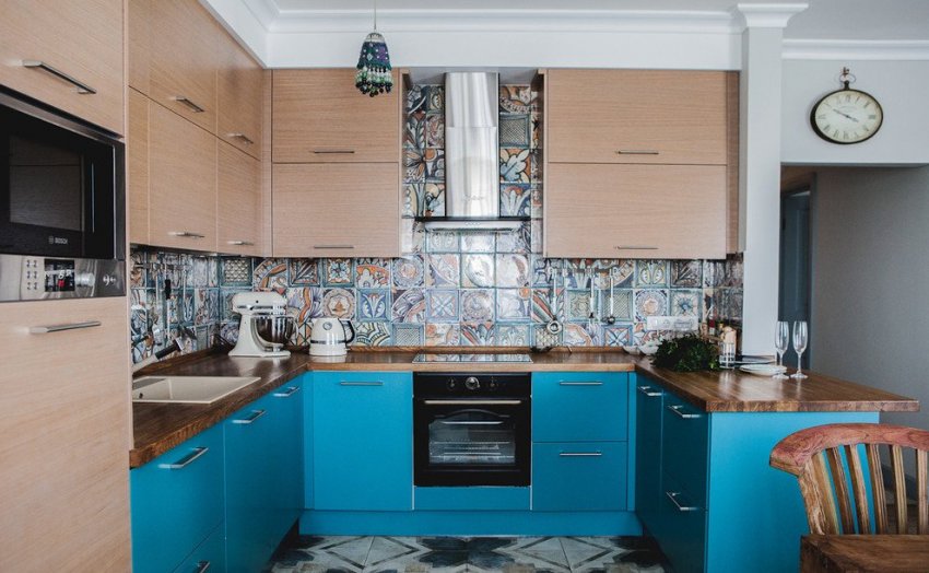 Гарнитур можно разместить на фоне пёстрого фартука