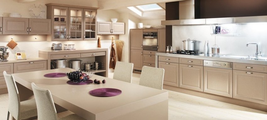 Оттенок кофе с молоком можно назвать универсальным, ведь он подходит как для современных, так и для классических вариантов дизайна кухни. Часто оттенок применяется в следующих стилях: