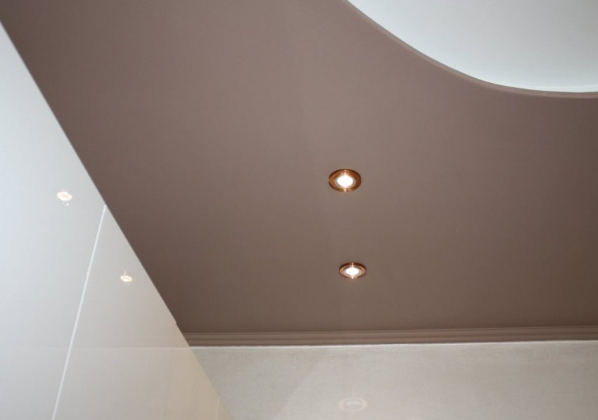 - потолок цвета капучино легко создать с помощью глянцевого или матового ПВХ покрытия. Монтаж гипсокартонной конструкции требует последующей отделки и окрашивания потолка и поэтому натяжной вариант более распространён. В любом случае потолок не должен быть слишком тёмным, что особенно важно на маленькой или плохо освещённой кухне. В противном случае помещение будет казаться визуально меньше, чем есть на самом деле. И также стоит разместить на каждом квадратном метре по 1 лампе мощностью не менее 20 Вт. Это позволит избежать ситуации, когда потолок цвета капучино кажется серым и грязным при плохом освещении;