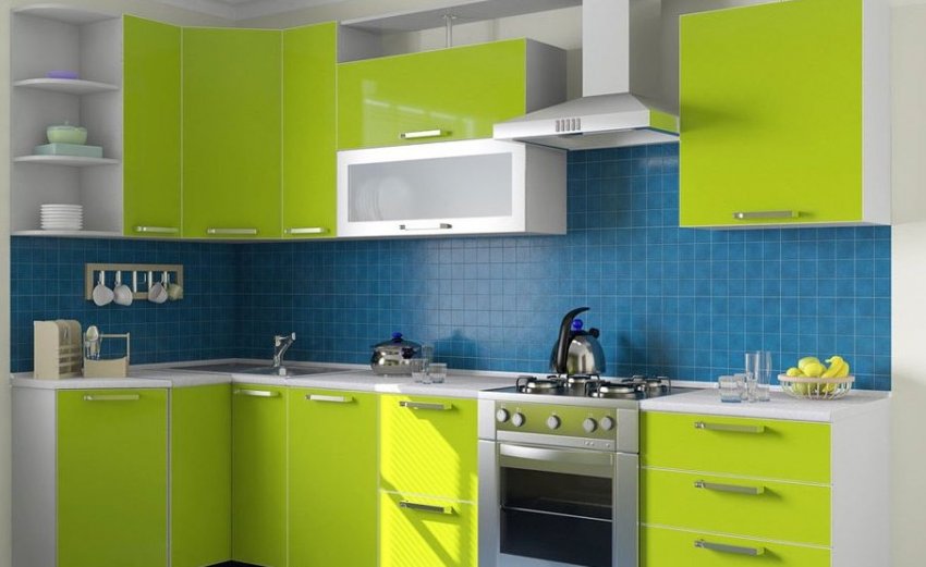 - дополнение салатового цвета синим или голубым — отличное решение для яркой, но в то же время лаконичной кухни. Такой интерьер ассоциируется с прохладой, морем и выглядит очень стильно;