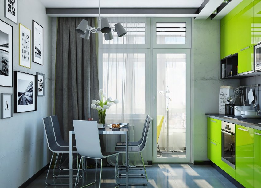 На фоне салатовой стены красиво смотрится серый гарнитур в современном стиле