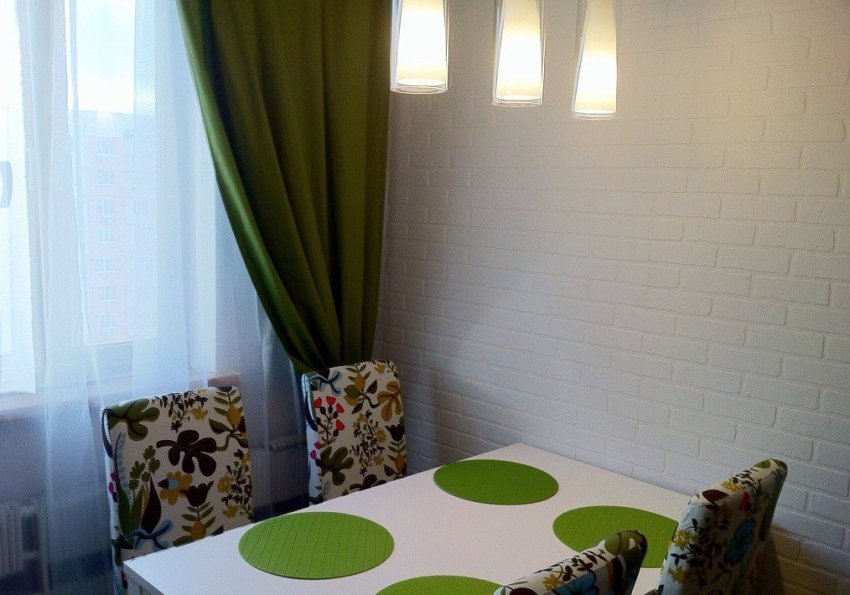 - яркий салатовый текстиль — отличная возможность разнообразить простой интерьер без проведения ремонта или замены мебели. Такой вариант подойдёт тогда, когда нет возможности провести капитальный ремонт на кухне или существует боязнь применения салатового цвета в обстановке. Для минимального наличия этого тона в обстановке достаточно использовать шторы и салфетки. Посуда может дополнять эти детали.