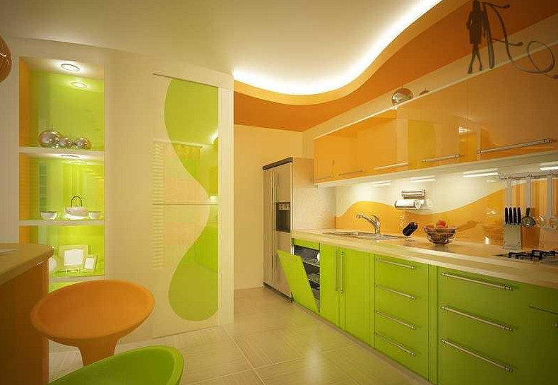 - салатовый и оранжевый — необычное и очень яркое сочетание для современного интерьера. Эти оттенки следует разбавлять нейтральными: белым, серым, бежевым и чёрным. Нейтральный фон в виде стен послужит хорошей основой для оранжево-салатового гарнитура. Если же такая яркая мебель не подходит владельцам жилья, то стоит выбрать текстиль и посуду;