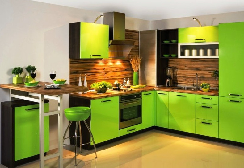 Яркий салатовый цвет — необычное решение для оформления кухни. Этот насыщенный тон следует использовать в интерьере осторожно, иначе он будет раздражать владельцев жилья. Для этого учитывают правила дизайна, подбирают гармоничные тона и структуру материалов.