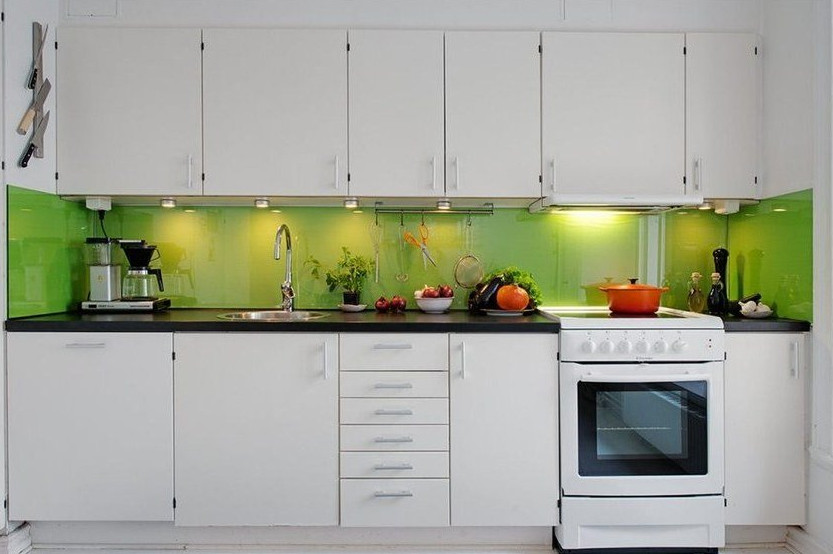 - яркий фартук или столешница — хорошее решение для создания небольшого акцента салатового оттенка. Материалом для фартука может служить стекло, пластик, керамическая плитка, а столешницы выполняются из искусственного камня или мраморной крошки, но есть варианты из ЛДСП с пластиковым покрытием. Одновременное использование салатового фартука и столешницы возможно, но не рекомендуется, ведь в таком случае эта зона визуально сольётся в один яркий акцент, резко выделяющийся в интерьере;
