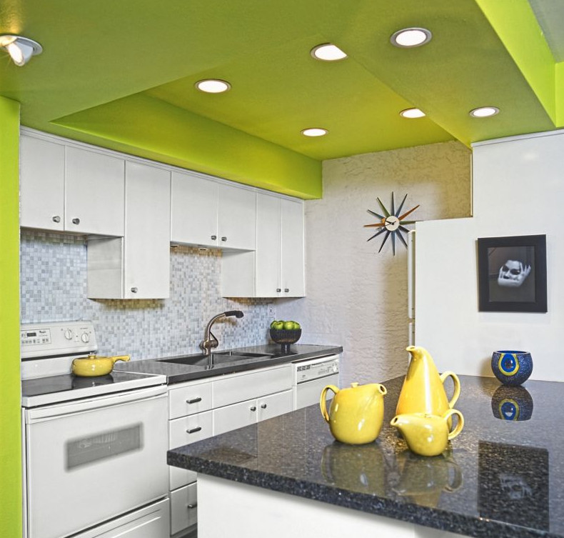 - для потолка лучше всего выбрать бледный оттенок салатового, так как яркий неоновый будет утяжелять помещение и сделает его некомфортным. В качестве материала для отделки можно выбрать натяжное ПВХ покрытие, окрашивание, гипсокартонные многоуровневые конструкции. Уместна и двухцветная окраска потолка. Например, белое покрытие с салатовыми узорами. При этом стоит использовать посуду или текстиль такого же оттенка;